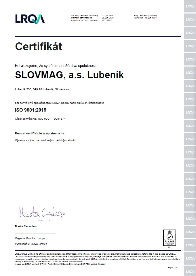 Systém manažérstva kvality podľa požiadaviek normy ISO 9001 bol 15.06. 1994 potvrdený certifikátom spoločnosti Lloyďs Register Quality Assurance a recertifikovaný v roku 2024.